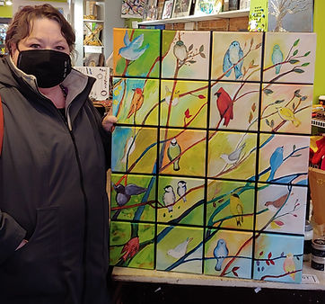 Our 2020 Tree of Lights project was the Tree of Birds. This was a special year as the Tree of Light campaign was actually halted because of the pandemic as the public was encouraged to stay home and stay safe. Several members took home individual canvases, and they all came together in this wonderful creation. As we were not able to submit this for display in the hospital halls, we offered this as an on-line auction, with much success.